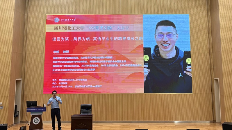 2025年10月18日,由外语学院承办的四川轻化工大学“652星光引路”大讲堂活动之“语言为桨跨界为帆”讲座在李白河校区尚艺馆报告厅举行。外语学院团委书记、学工办主任谭贤军与学工办老师刘芯伶出席活动。
