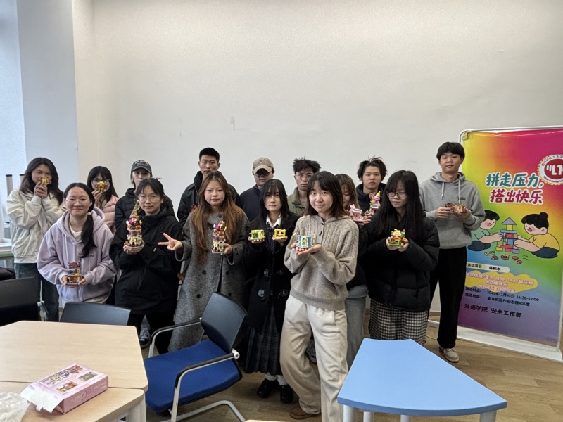 在“12·5 要爱我”大学生心理健康日来临之际,为帮助同学们在期末阶段有效调适情绪、提升心理韧性,外语学院于2025年12月10日在宜宾校区励志楼405教室面向全校学生举办了“减压积木创作:拼走压力,搭出快乐”心理健康主题活动。本次活动由学院安全工作部徐一丹同学主持,心理中心苏欣宇老师及学工办温淳、吴彤老师共同参与。