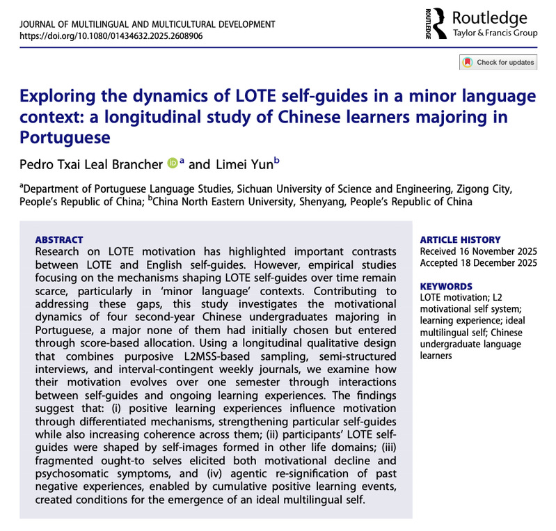 近日,外语学院巴西籍教师Pedro Brancher博士在非通用语(LOTE)学习动机研究方面取得突破,相关研究成果以“Exploring the dynamics of LOTE self-guides in a minor language context: a longitudinal study of Chinese learners majoring in Portuguese”为题发表于国际期刊《Journal of Multilingual and Multicultural Development》(IF:3.9 中科院1区TOP)。