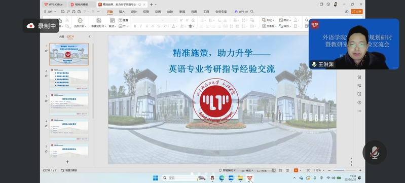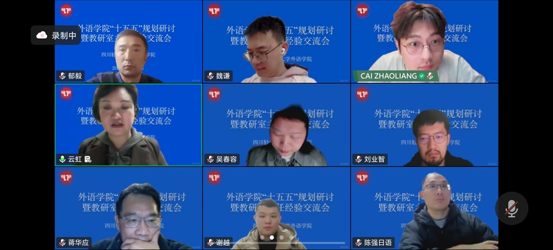 2026年3月25日晚上19:00,外语学院召开“十五五”规划研讨暨教研室主任经验交流会,学院领导、各教研室主任、学科办全体成员齐聚云端,围绕学科建设、教学改革与人才培养核心任务,共谋学院“十五五”高质量发展新篇章。会议由副院长吴春容主持。