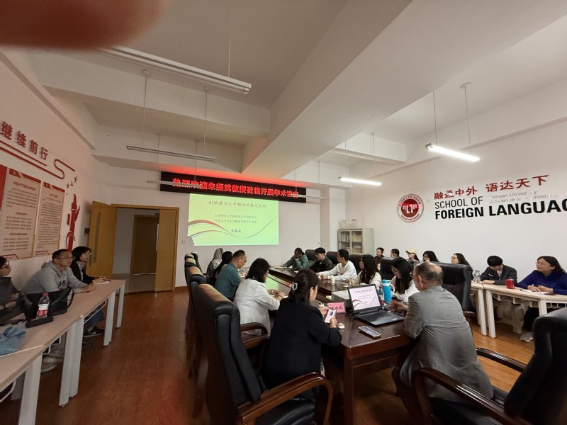4月20日上午,学院在宜宾校区A1-435邀请到上海师范大学国家重点学科负责人及外国文学文化与翻译学博士生导师朱振武教授应邀为师生作题为“AI赋能与文学翻译的高光时刻”的学术讲座,学院领导、教研室负责人、教授博士代表参加本次讲座,副院长左义主持讲座。