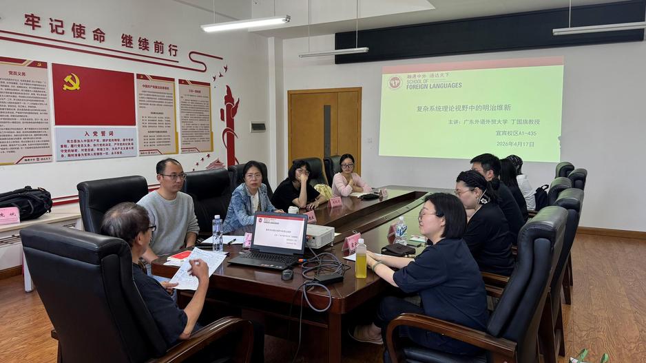 为切实提升教师的科研敏锐度与项目申报能力,4月17日,学院邀请广东外语外贸大学博士生导师丁国旗教授在宜宾校区A1-435举办日本研究选题与项目申报学术讲座。日语系主任陈强、教师代表霍云立、马艳波、刘淙淙及高年级学生代表参加本次讲座。