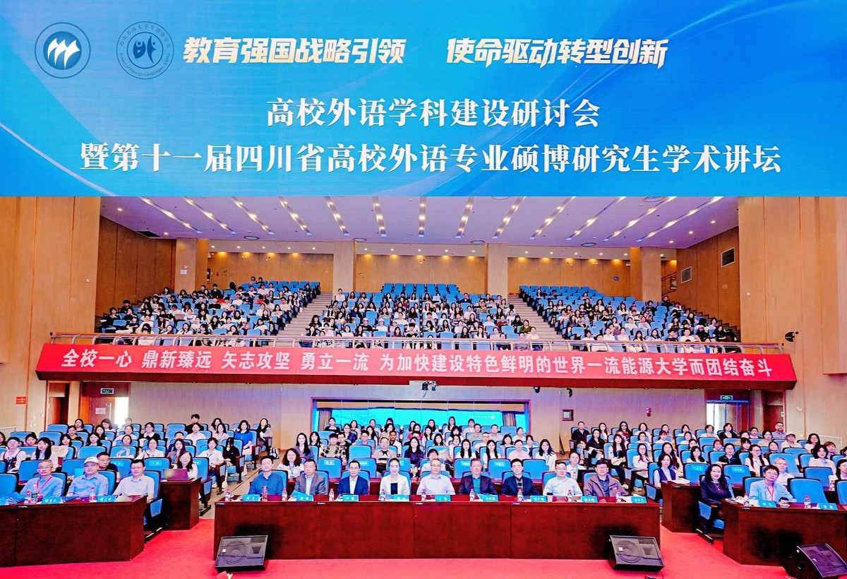 为深入推进外语学科转型创新,加强省内高校外语专业学术交流,4月24—26日“四川省高校外语学科建设研讨会暨第十一届四川省高校外语专业硕博研究生学术讲坛” 在西南石油大学隆重举行。论坛以 “教育强国战略引领 使命驱动转型创新”为主题,由四川省人民政府学位委员会办公室指导,四川省应用外语研究会、四川省高等教育学会高校外语专业委员会、四川省高校外语专业硕博研究生学术论坛组委会与西南石油大学联合主办,汇聚全省高校外语领域专家学者、师生代表 500 余人,共话学科发展、共研学术前沿。我院高度重视、精心组织,由外语学院副院长吴春容、陈有斌老师带队,5名研究生参会交流,展现了扎实的学术素养与优良的科研风貌。